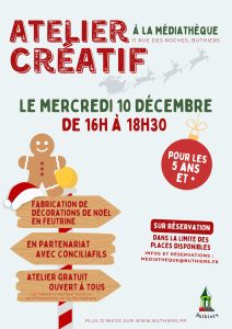 En partenariat avec l’association Conciliafils, l’équipe de la médiathèque propose à ses membres* un atelier créatif ⭐ Fabrication de décorations de Noël en feutrine⭐
