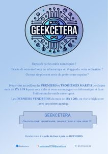 La commune de Buthiers a la chance d’accueillir une nouvelle association GEEKCETERA, ses activités :